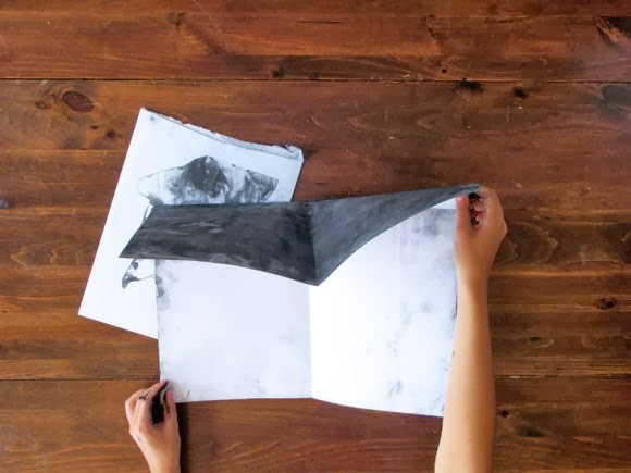 Put the hard cover notebook on the fabric wide open (wrong side up).
